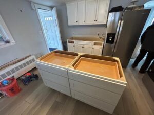 We installed stunning Calacatta Cosmos quartz in this Brockton, MA kitchen—bringing a bold, elegant look with dramatic veining and a durable, low-maintenance surface.