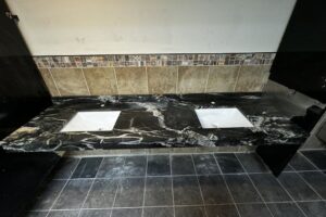 This commercial bathroom upgrade features a sleek double-sink countertop crafted from titanium granite, complete with a 4” backsplash, apron, and white square porcelain sinks. Designed for durability and elegance, the installation enhances both the functionality and aesthetics of the bathroom space.