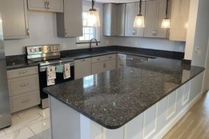 Elegant Blue Pearl Granite Kitchen Installation This kitchen was beautifully upgraded with Blue Pearl granite countertops, featuring a custom 4” backsplash and a handcrafted stainless steel under-mount sink. A perfect blend of durability and sophistication. Completed in Hudson. Whatsapp Envelope