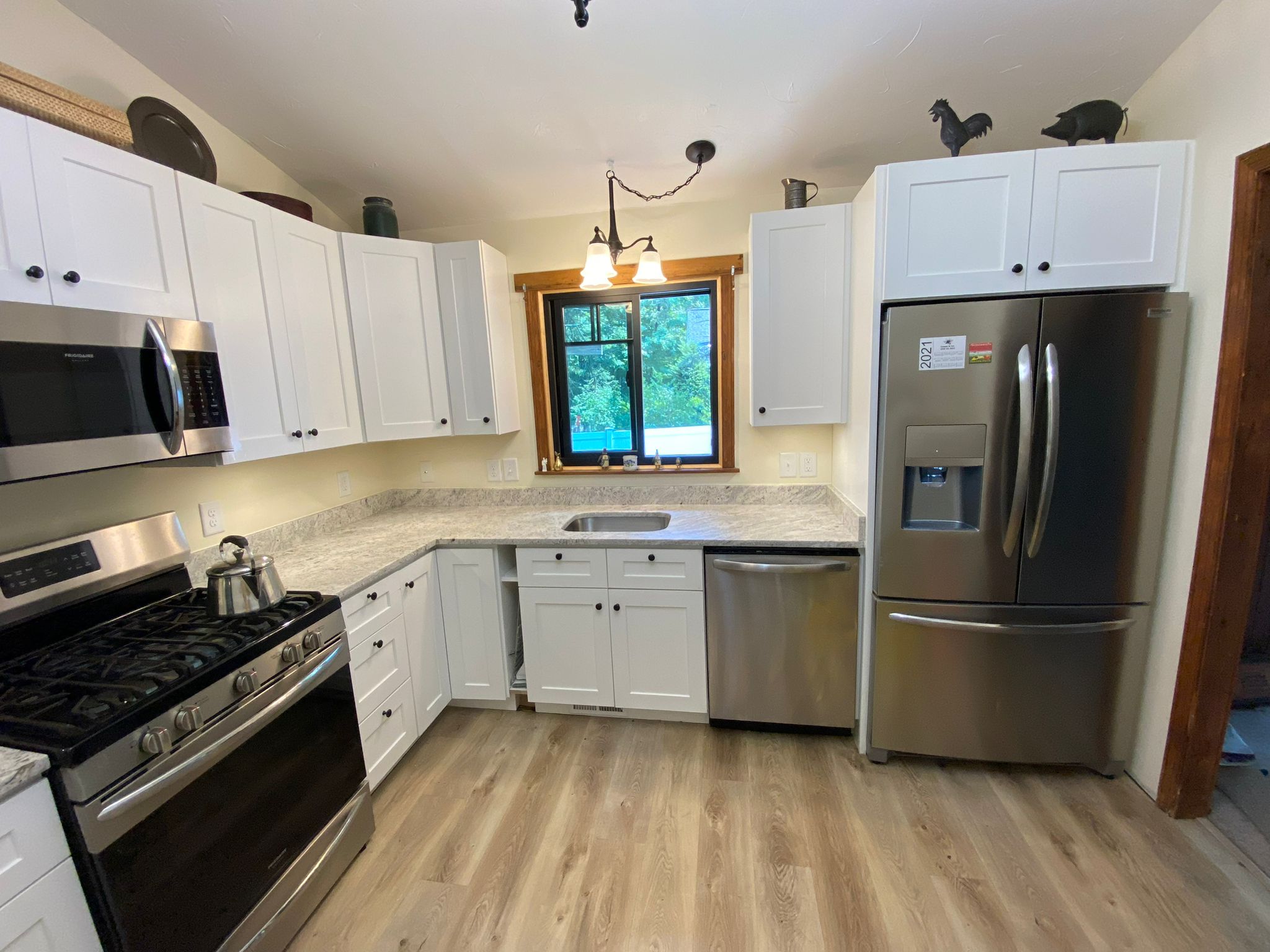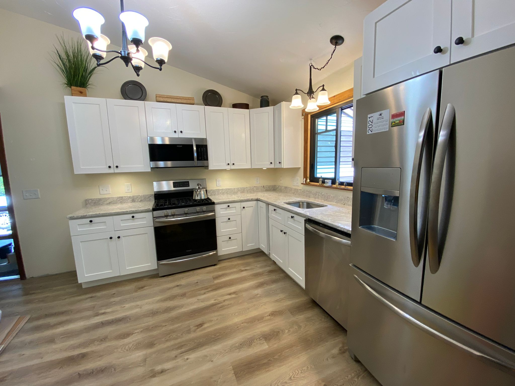 This project features stunning River White granite countertops paired with a 4” backsplash for a seamless and elegant look. The addition of a handcrafted stainless steel sink enhances both the functionality and modern appeal of the space.