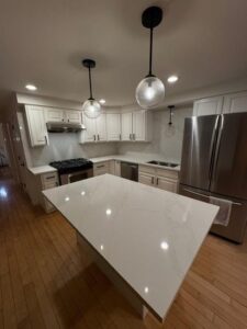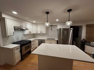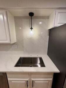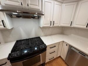 Kitchen Upgrade in Framingham, MA In this Framingham kitchen, we replaced the old granite countertop and tile backsplash with elegant Old Roman quartz, extending it to a full-height backsplash. A custom handmade stainless steel undermount sink completed the modern transformation. AllBeforeAfter Load More