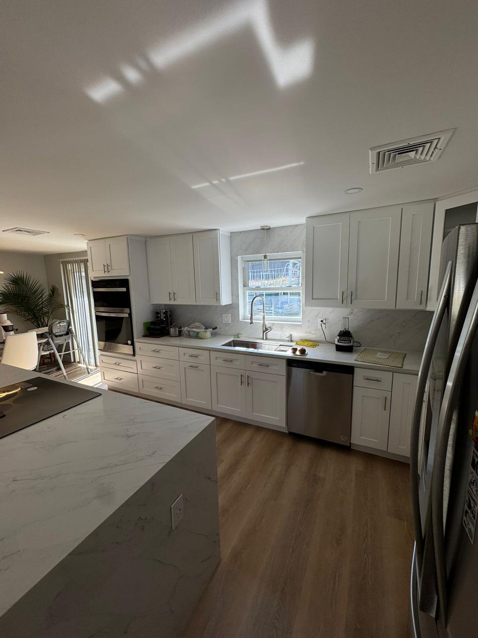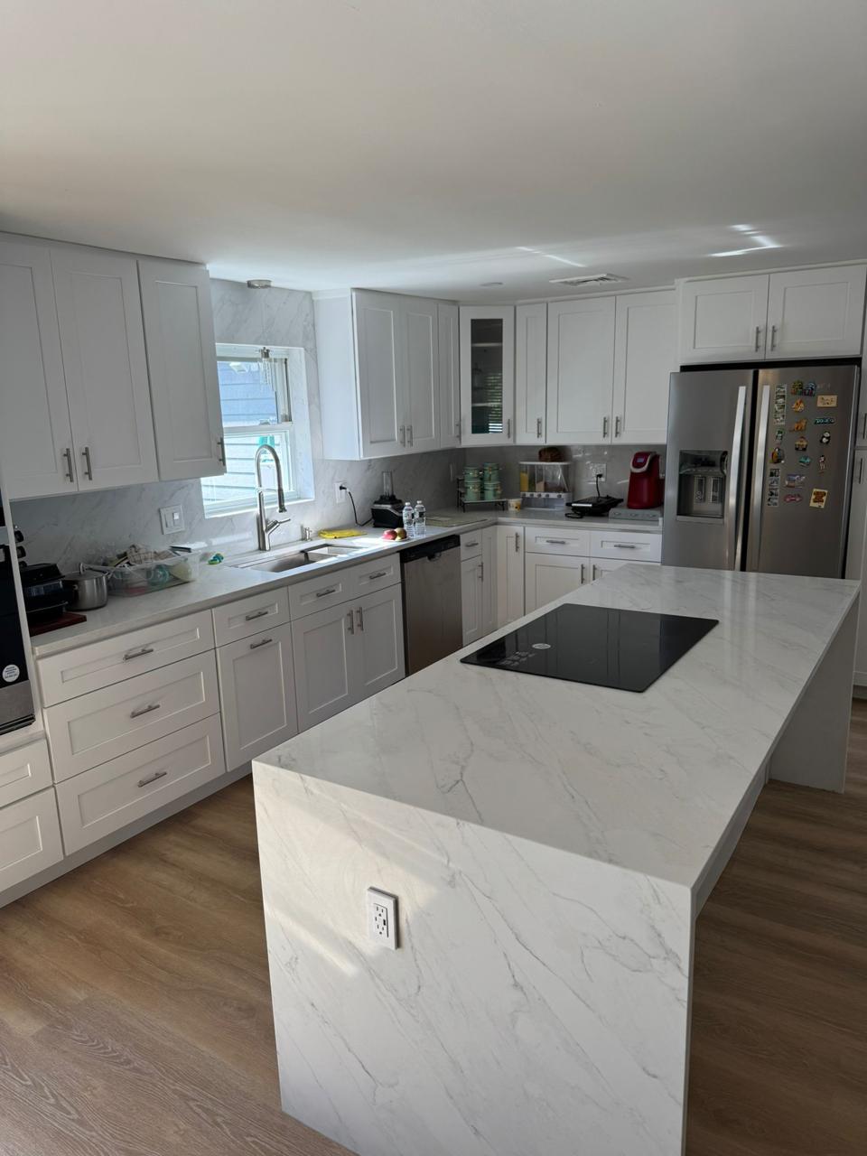 This project showcases stunning quartz countertops with a waterfall edge on both sides of the island. A full-height backsplash extends to the upper cabinets and surrounds the window, while precise sink and cooktop cutouts feature a stainless steel handmade undermount sink for a sleek, functional finish.