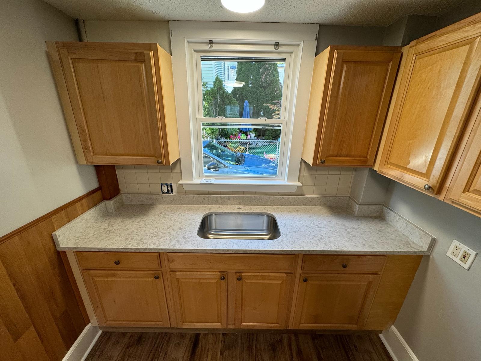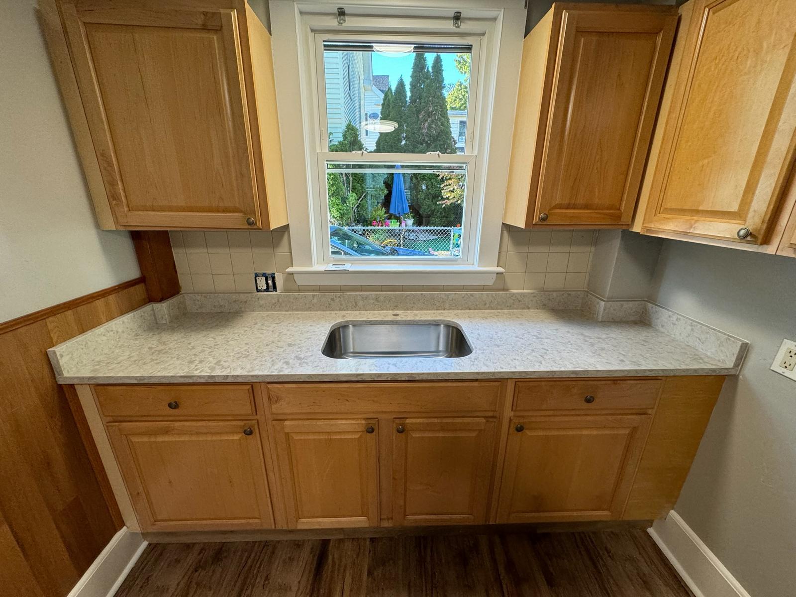 Pantry Countertop Upgrade This project highlights a refined pantry countertop paired with a stainless steel under-mount sink. A perfect blend of style and practicality for a functional space.