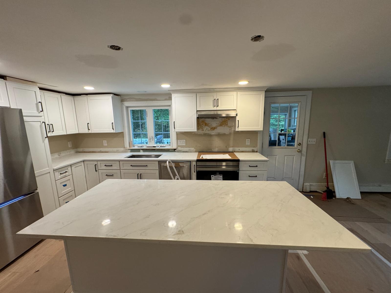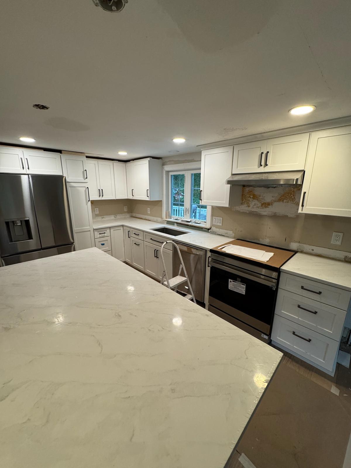 This project featured the installation of a stunning quartz kitchen countertop paired with a spacious island. The island design includes an overhang for a seating area on all sides, creating a perfect balance of functionality and style. A handmade stainless steel undermount sink was seamlessly integrated, adding durability and elegance to the space.