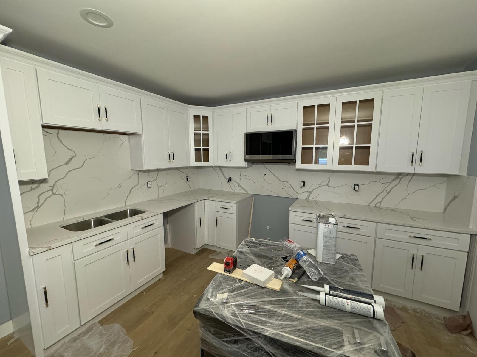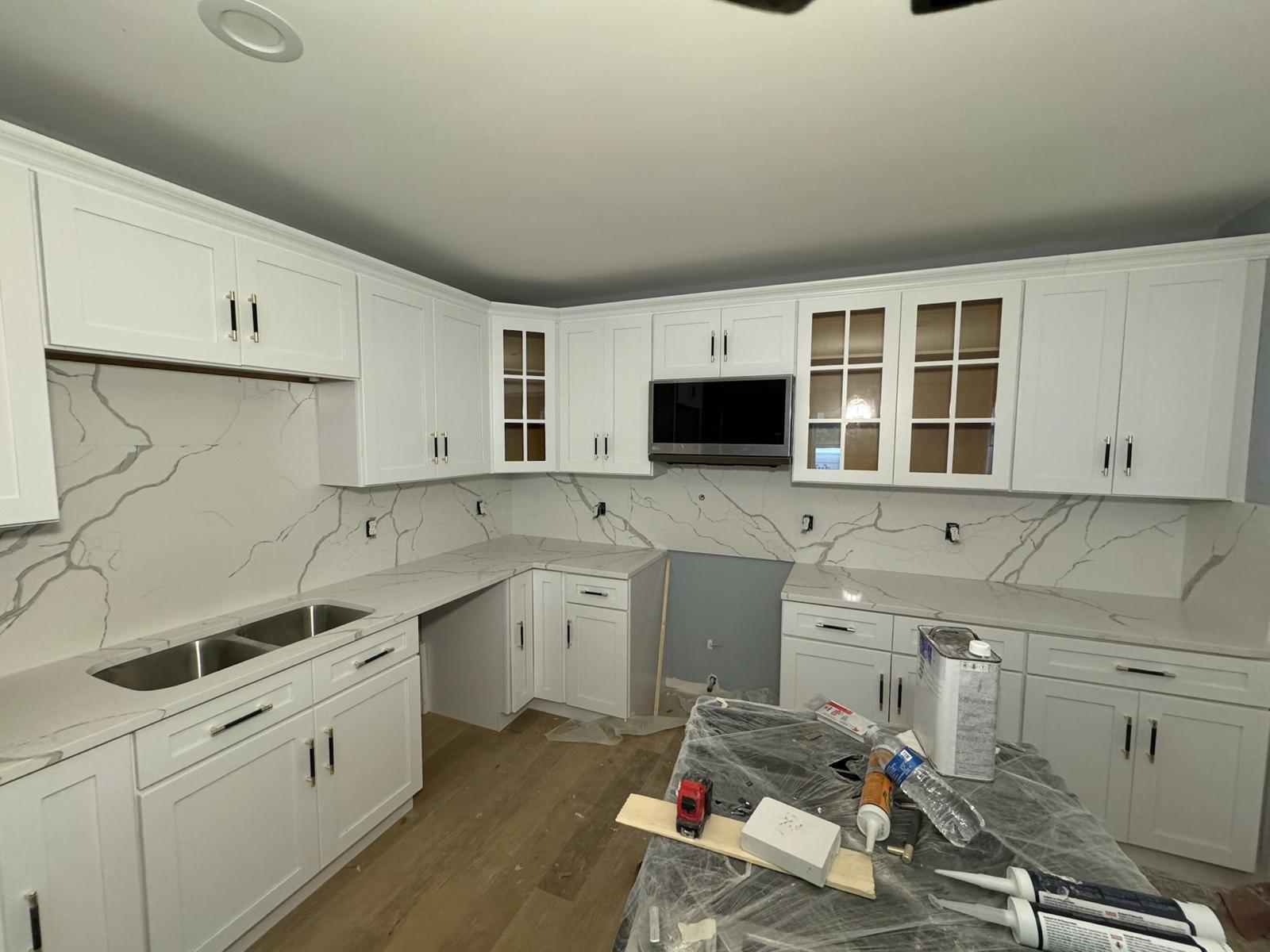This project features a sleek quartz countertop paired with a full-height backsplash for a seamless, modern look. A stainless steel 50/50 undermount sink adds both functionality and style to complete the design.
