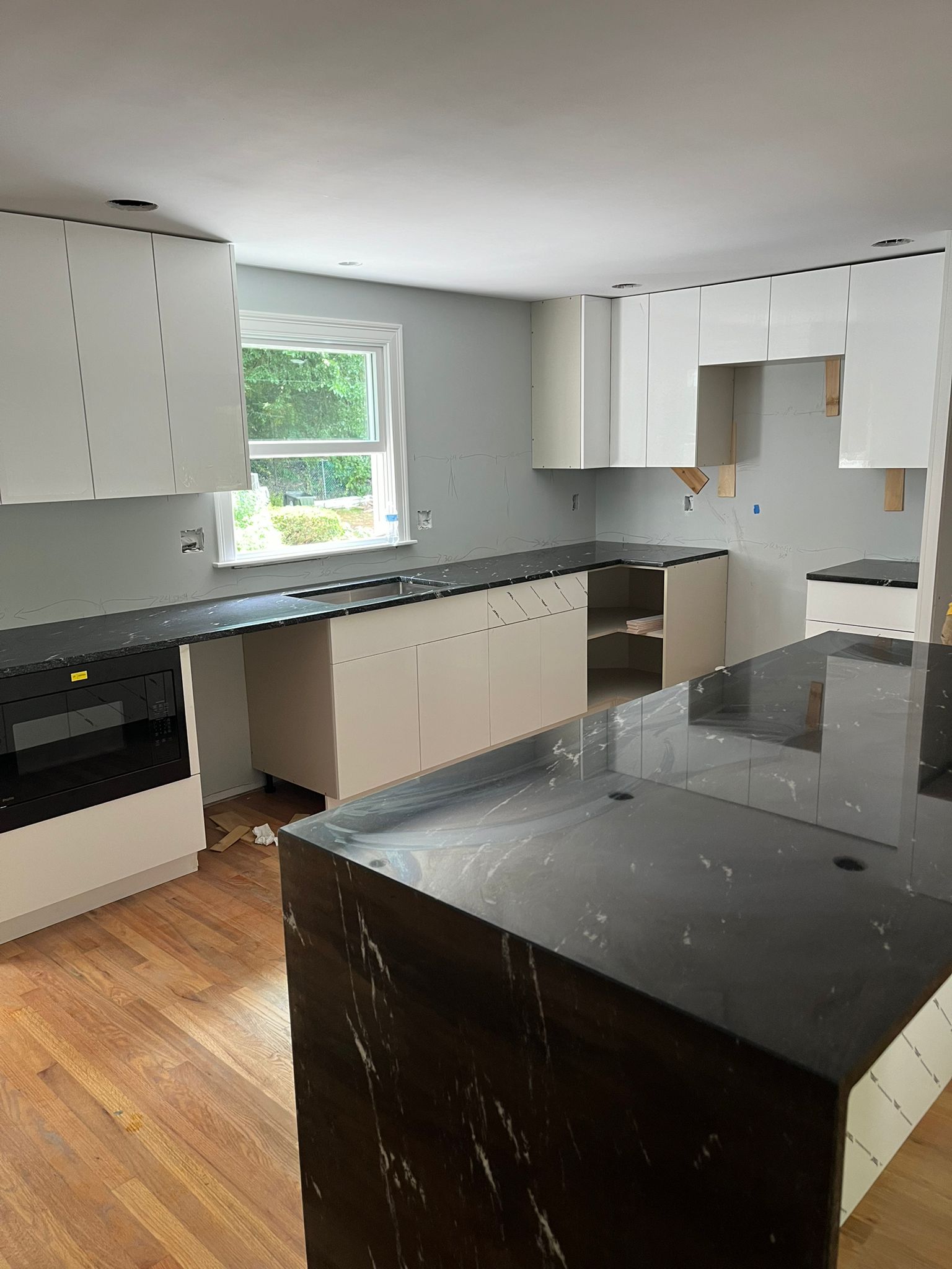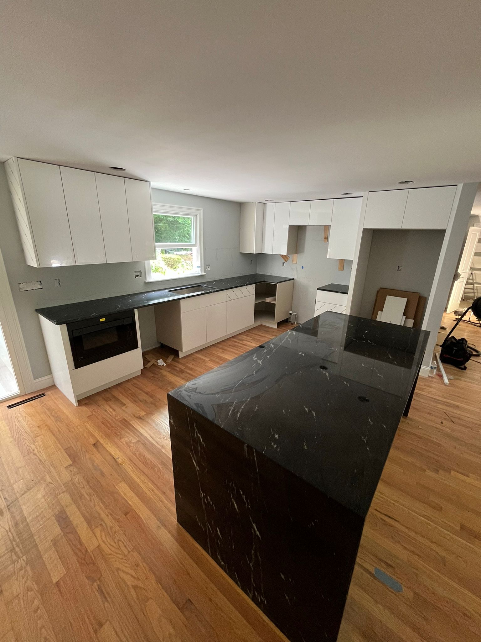This project features a stunning quartz kitchen countertop installation, complete with elegant waterfall edges on both sides of the island. A modern design statement with lasting durability.