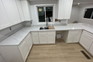 This elegant and modern kitchen features sleek white quartz countertops with subtle veining for a timeless appeal. A stunning waterfall island seamlessly extends the quartz from the surface to the sides, complemented by a 12” overhang for a comfortable seating area. Finished with a 4” backsplash and a handmade under-mounted sink, this design blends luxury with functionality.